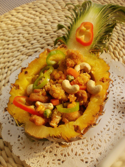 黄灿灿的凤梨做钵,貌似富贵金盆;腰果舍去惯常的油炸方法,进而选择烘烤一是因为保留本色,使其神似银元,二是因为和炸过的鸡块中和而不致太过油腻;炸过的咖喱鸡块儿、凤梨丁、玉米粒则都是紧扣主题的金黄色。因为有了凤梨的加入,这道菜的口感很特别、很丰富哦~