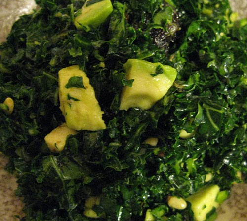 最近有点小迷恋吃raw food,就是未经烹煮的食物。羽衣甘藍的营养很丰富,比如说维生素a,c,b2,已经各种矿物质(包括,钙,铁,钾等等)。牛油果也是很有营养价值的,丰富的维生素e、氨基酸、叶酸,胚芽脂醇、不饱和脂肪、叶酸钾和纤维,这种低能量的食品可以防止高血压、动脉硬化和贫血等。松子嘛,就更不用说了,含有大量的不饱和脂肪酸,对心脑血管疾病的预防很帮助,再有就是大量矿物质如钙、铁、磷、钾等等。 这是一款吃起来香香的沙拉,一点也不会觉得素,我个人很喜欢跟大家分享一下吧!