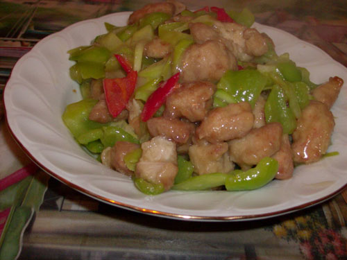 及以下步骤:把浆料用手抓匀、腌制20分钟。 炒锅热油7分热、下浆好的火鸡肉块、小火炸制。 大点火、过二次油。炸制成金黄色即可。 切一段葱丝。切一点黄瓜片。做配菜。 炒锅放少许油、炒葱丝和配菜。 再加入火鸡肉段一同翻炒片刻、待入味即可盛出来。 小火烧芡汁。 芡汁烧好了、把火鸡肉段倒入热芡汁上、翻炒挂糊即可。这个菜酸甜微辣可口。 小火烧芡汁。 芡汁烧好了、把火鸡肉段倒入热芡汁上、翻炒挂糊即可。这个菜酸甜微辣可口。