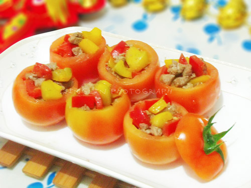 牛与六读音上有点相似,把牛肉丁与漂亮的彩椒丁一起炒,再放入美女我最喜欢的番茄里蒸,意味六牛大顺!!嘿!想想就很棒!也寓意新的一年有个好彩头!