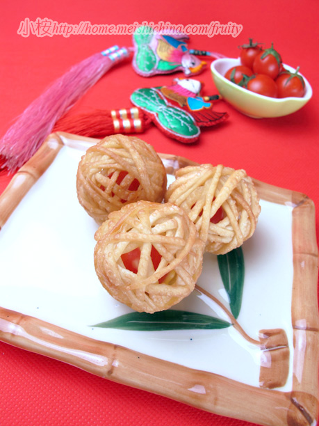 2.圣女果尽量选的小粒些,这样也省黄油也好包裹。
