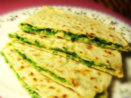 及以下步骤:按扁,擀成圆形薄饼。 在半圆的位置上,涂抹均匀馅料,边缘处少留空。 将另一半对折过来。 将边缘捏合住,并去掉多余的饼皮边。(我习惯用碗边沿着饼的弧形边缘滚一圈,将多余的面皮去掉) 平底锅中刷少许油,放入饼坯。中小火烙制,一面上色时翻面。 待另一面上色后再次翻面。当馅饼有鼓起,两面均上色时即熟。 出锅装盘。 装入盘中,切开,就可以品尝咯~韭菜馅的还是趁热吃味道正宗哈! 出锅装盘。 装入盘中,切开,就可以品尝咯~韭菜馅的还是趁热吃味道正宗哈!