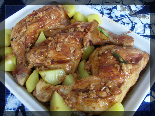 前两天用sake烧鱼的时候就不舒服, 明明我们的米酒更香甜的 所以就跑去买了酒酿回来, 琢磨着鸡腿该是合适的, 买了三根 鸡腿先腌, 后烧, 再烤. 米酒汁到最后非常浓稠 味道香甜, 配着沾满汁外脆里软的土豆...