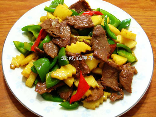 青椒(两个) / 红辣椒(一个) / 牛肉(60克) / 红富士苹果(一个) / 葱姜适量干淀粉(少许)