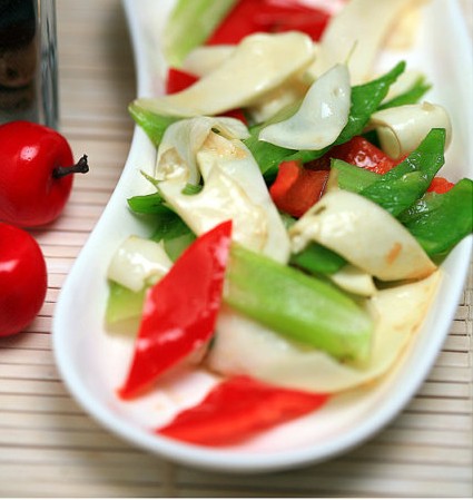3、锅中做油,煸香葱姜蒜末炒香,放入黄喉、红绿辣椒块炒匀;放入绍酒、胡椒粉、盐调味,最后放入西芹块快速炒匀即可出锅前烹入香醋装盘。