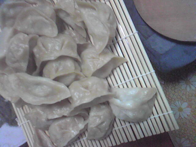 4、擀皮,包饺,上锅蒸喽。图片弄的不是很完整。吽吽太着急吃饺子了。味道不错,很水灵。