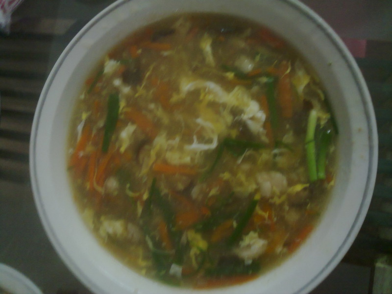 3、将红萝卜放入约五分钟后加入瘦肉,三分钟,加调料包,最后小许淀粉水,用汤匙将汤慢慢顺时针推开,使汤变得绸,最后加入小许盐,香油,鸡蛋,约一分钟,关火,瑶柱虾米海鲜羹成功了!