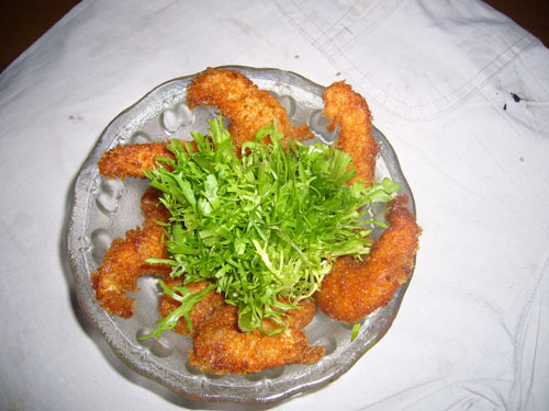 料酒(适量) / 盐(适量) / 葱(适量) / 姜(适量) / 面包糠(适量) / 鸡蛋(适量) / 面粉(适量) / 干淀粉(适量) / 黑胡椒粉(适量) / 椒盐(适量) / 十三香(适量) / 小青菜(适量)