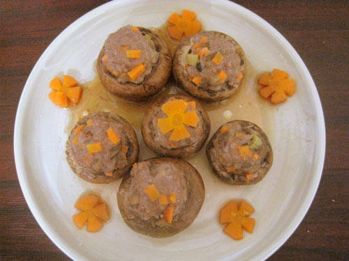 及以下步骤:撒入生粉,加点冷水搅打均匀。 蘑菇洗净,掰掉蘑菇梗,背面切十字刀,不要切段。 蘑菇梗,芹菜,胡萝卜都切成丁。 .三种丁倒入腌好的牛肉中拌匀,做成馅料。 将拌好的馅添入蘑菇盖子中,压实,蘑菇花篮就做好了。 这是做好的6个,上锅大火蒸。 剩下的胡萝卜切成小花状。 胡萝卜飞水。 15分钟后关火,放入飞水的萝卜片,盖盖焖5分钟即可。 15分钟后关火,放入飞水的萝卜片,盖盖焖5分钟即可。