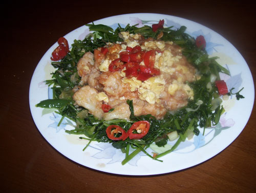 及以下步骤:炒锅烧热、倒入一勺豆油、先炒花椒,待出香味、把花椒去除。 用热的花椒油炒葱花和辣椒。 把香菜段放锅内,和葱辣椒在一起翻炒片刻,加入一点海鲜酱油。 把炒好的香菜盛入盘子。 把炒锅刷洗干净烧热水,把菜花汆烫。 菜花烫好以后、控净水份。锅放一点豆油烧热,炒菜花,放番茄酱。调入一点芡汁。芡汁有土豆粉,盐,酱油。一点白糖。 菜花炒好了,把菜盛在炒好的香菜盘子上面。 菜里面没有肉。炒一个鸡蛋放在菜花上面。 再炒一个红辣椒,也添加在菜的上面。这个辣椒比较辣。 还有点胡萝卜和西红柿也摆放在菜的上面。
