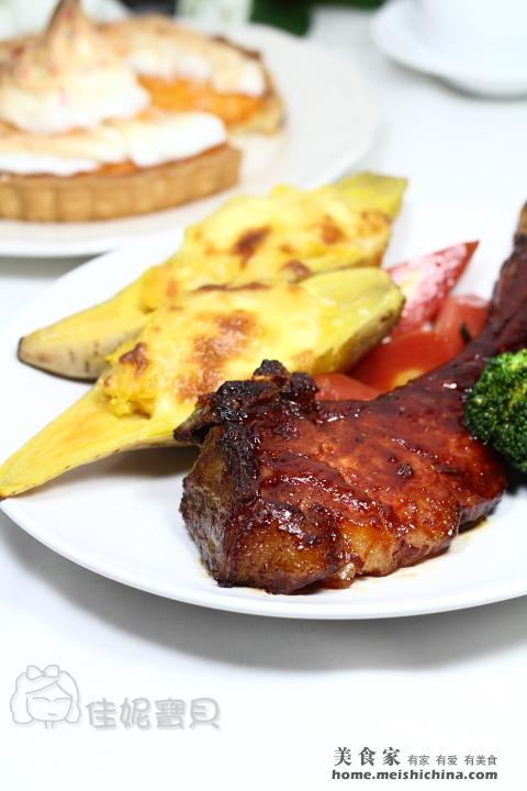 及以下步骤:法切猪排用奥尔良鸡翅粉和百里香腌制过夜(直接将干粉抹在猪排上)。 将蜜汁刷在腌制好的猪排上。 法切猪排用奥尔良鸡翅粉和百里香腌制过夜(直接将干粉抹在猪排上)。 将蜜汁刷在腌制好的猪排上。 法切猪排用奥尔良鸡翅粉和百里香腌制过夜(直接将干粉抹在猪排上)。 将蜜汁刷在腌制好的猪排上。 法切猪排用奥尔良鸡翅粉和百里香腌制过夜(直接将干粉抹在猪排上)。 将蜜汁刷在腌制好的猪排上。 用锡纸将猪排包裹好,放入200°预热好的烤箱里,烤制20分钟左右。 再将锡纸打开,刷上蜜汁调料,继续烤制20分钟左右(中途需要翻面两次并刷蜜汁,烤制到表面上色到你满意的程度为止)。