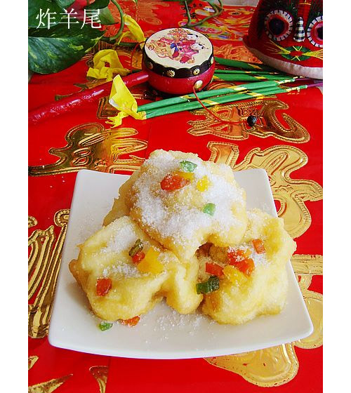 此菜始创于清朝末年,原本是用羊尾作馅炸成的,因其油腻且有难吃的膻味,不大受人欢迎,后来厨师将羊尾馅换成了豆沙馅,其形状和颜色都保持原来的样子,则深受欢迎,因此还叫炸羊尾。