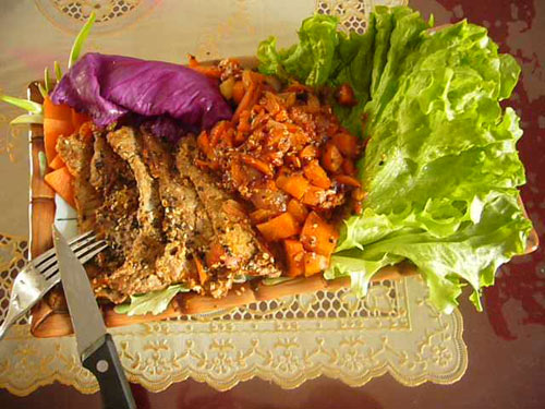 洋葱(半个) / 生抽(适量) / 鸡蛋(适量) / 胡萝卜(1个) / 西红柿(1个) / 番茄酱(适量) / 橄榄油(适量) / 黑胡椒粉(适量) / 生菜(适量) / 花椒粉(适量) / 精盐(适量) / 黑白芝麻(适量) / 耗油(适量) / 红酒(适量)