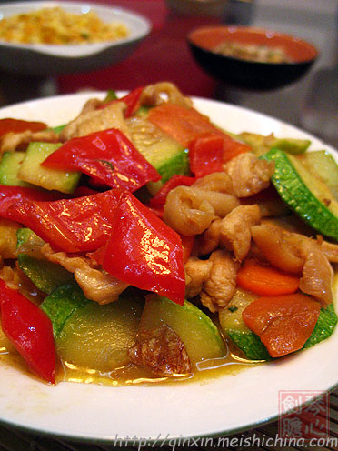 及以下步骤:将鸡脯肉切片用胡椒粉、盐、油稍腌十分钟。 西葫芦洗净备用。 将鸡脯肉切片用胡椒粉、盐、油稍腌十分钟。 西葫芦洗净备用。 将鸡脯肉切片用胡椒粉、盐、油稍腌十分钟。 西葫芦洗净备用。 西葫芦、胡萝卜、红椒切片待用。 起油锅,爆香姜蒜,下肌肉滑至八成熟。 依次加如胡萝卜,红椒,西葫芦下锅煸炒。 待西葫芦快断青,沿锅边溜些水,加盐、生抽调味,盖上锅盖稍焖1分钟。