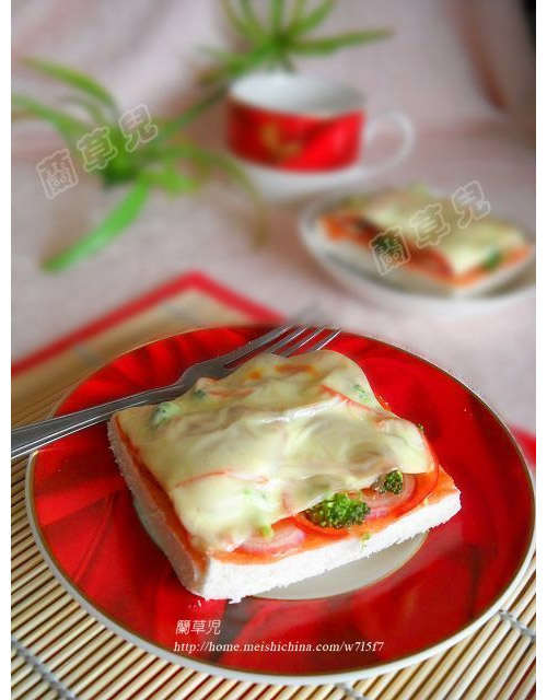西兰花(少许) / 洋葱(少许) / 红椒(少许) / 番茄沙司(6茶匙) / 香肚(少许) / 原味芝士(2片)