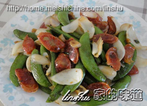 及以下步骤:最后加入蒜片鸡精出锅。 腊肠切片,葱切段、姜切丝、蒜切片备用。 甜豆角摘好,去掉两侧的筋,甜豆角用开水焯一下,变色后捞出过凉水。 腊肠切片,葱切段、姜切丝、蒜切片备用。 甜豆角摘好,去掉两侧的筋,甜豆角用开水焯一下,变色后捞出过凉水。 百合洗净,掰成片备用。 炒勺加少许油,放入葱姜爆香,然后倒入甜豆角翻炒几下 放入腊肠继续炒片刻。 然后放入百合,加少许盐、生抽、点少许水翻炒几下。 最后加入蒜片鸡精出锅。