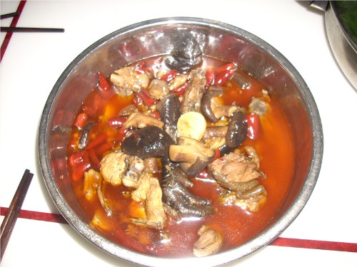 及以下步骤:5分钟后,捞出控油。 下老姜,独蒜爆炒,注意次序。 炒到独蒜颜色开始有点变黄,马上下鸡肉爆炒。下料酒一小勺。 下豆瓣和匀净。倒入沉淀好的泡辣椒.花椒用过的汤水,以漫过原料两厘米水为佳。 再次倒入油炸过得,辣椒,花椒,放少许酱油,盐,鸡精。 等烧开后放香菇,中火烧制,不能离人,要随时观看。 放1/8块火锅底料,加少许白糖提味,小火烧30分钟左右起锅,起锅前自己尝试味道咸还是淡,放味精起锅,要是觉得咸了可以不放味精直接起锅。 再次倒入油炸过得,辣椒,花椒,放少许酱油,盐,鸡精。 等烧开后放香菇,中火烧制,不能离人,要随时观看。 放1/8块火锅底料,加少许白糖提味,小火烧30分钟左右起锅,起锅前自己尝试味道咸还是淡,放味精起锅,要是觉得咸了可以不放味精直接起锅。