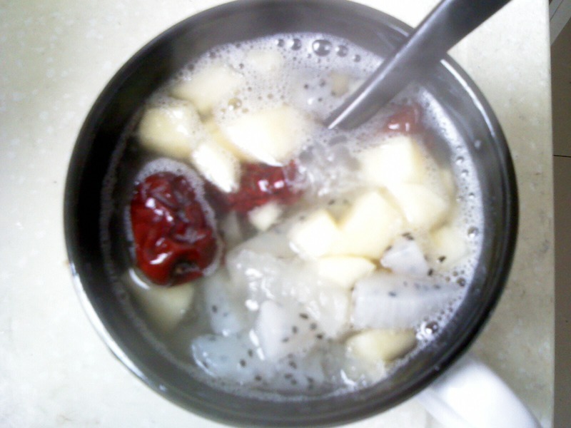 及以下步骤:水果银耳羹:先煮银耳,我还是用的是砂锅,银耳容易烂。 水果银耳羹:银耳熟了后,放红枣、龙眼,过个10分钟把苹果和火龙果丢下去,喜欢吃甜食的同志们可以加点冰糖。 水果银耳羹:近看下,料多多的哟,营养的下午点心,哦耶。 水果银耳羹:准备了点红枣,泡泡,女生多吃红枣,很补的哟。 水果银耳羹:火龙果切丁。 水果银耳羹:苹果切后用淡盐水浸泡,就不会变色啦。 水果银耳羹:剥了点龙眼,嘿嘿。 水果银耳羹:先煮银耳,我还是用的是砂锅,银耳容易烂。 水果银耳羹:银耳熟了后,放红枣、龙眼,过个10分钟把苹果和火龙果丢下去,喜欢吃甜食的同志们可以加点冰糖。 水果银耳羹:近看下,料多多的哟,营养的下午点心,哦耶。