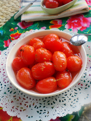 西红柿拌白糖是我从小吃到大的一道家宴必备菜~简单、爽口、酸酸甜甜,还能开胃解酒~可是大勺大勺的白糖毕竟还是有那么点的不适合家里诸位血糖日益见长的长辈们哈~于是乎,这道健康更好味的开运蜜汁小红果就当仁不让的取代了其以往的位置,成了我们家的家宴头牌~ 鸿运当头,当红不让~现在我们家聚餐的时候这道菜往往要准备几大盘——聊天零食有它;餐前开胃有它;酒至酣时更要有它~ 简单的做法,不俗的味道,介绍给美食家的各位筒子~我敢保证,你只要试过一次,这道美味就会成为你家的常客的~