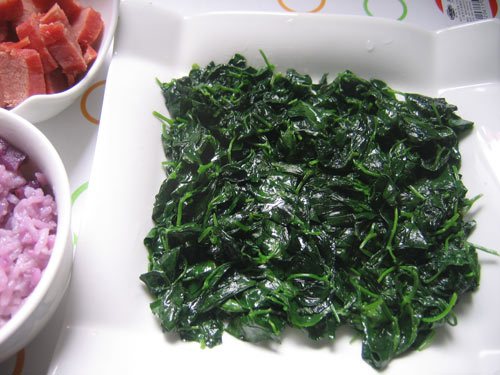 5、草头煸软后加糖,淋入高粱酒翻炒几下出锅。