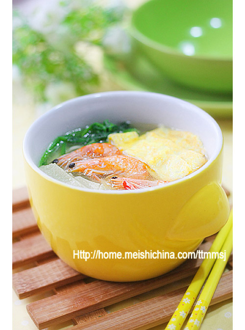 及以下步骤:菠菜去蒂洗净、基围虾解冻。 鸡蛋打散,豆丝切成长条。 菠菜去蒂洗净、基围虾解冻。 鸡蛋打散,豆丝切成长条。 菠菜去蒂洗净、基围虾解冻。 鸡蛋打散,豆丝切成长条。 平底锅烧热,刷少量油,倒入鸡蛋摊成蛋皮。 扣出、卷起,切成与豆丝等宽的长条状。 汤锅中注入适量水或高汤,大火煮沸后下入菠菜、虾和蛋皮,加入适量植物油和盐。 重新沸腾后下入豆丝,再煮五分钟即可关火,起锅时加入少量鸡精和胡椒粉调味。
