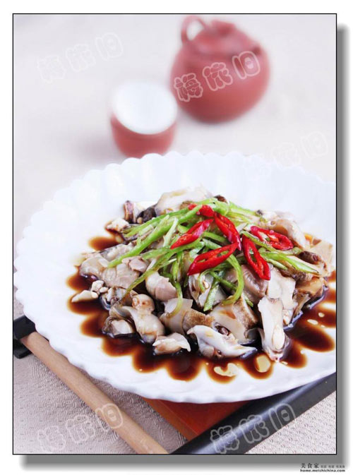 6、撒上葱丝、嫩姜丝、青红椒丝,淋上生抽一大匙,白胡椒粉少许,泼上两大匙滚油即可火侯掌握恰当,螺肉柔软爽脆,味道清甜滋美。