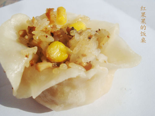 及以下步骤:肉馅变色后,放入葱蒜翻炒。 倒入玉米粒、香菇丁翻炒。 加入糯米饭翻炒,如果锅中比较干可以放点水。 炒好的馅料。 面粉中加入适量的开水,用筷子搅拌。 和成软硬适中的面团。 和包饺子一样,将面搓成长条。 切成小剂子,并且压扁。擀成中间略厚,四周略薄的圆片。 .取适量的馅放到皮中间,用手将皮收起,然后在半腰处掬起。 这样的就成形了。