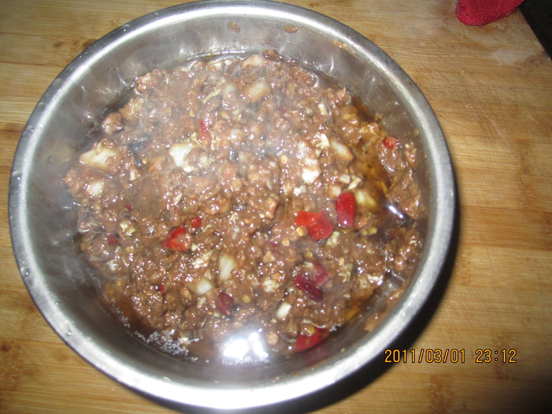 6、蘑菇泡发切碎,肉肉剁碎,辣椒切碎。