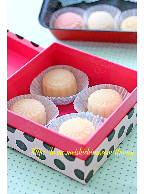 上面盒子中的成品图是第三次做的,花纹很清晰,饼皮看起来很q很透亮,所以建议大家如果要尝试冰皮月饼,又不想被粘手的面团搞得头大,还是试试我这个方子。