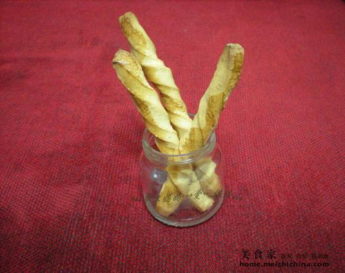 6、在做好的条儿上刷一层全蛋液,就可以进烤箱烘焙了。烤箱事先预热到180度,烤盘放入中层,约25分钟。烤到表面金黄色即可。