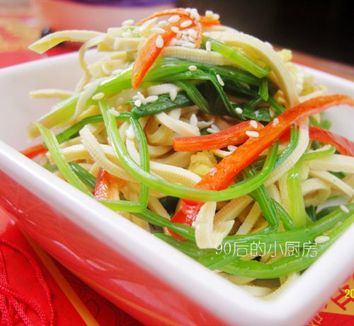 及以下步骤:菠菜洗净切段、红椒切丝、千张切丝,生姜切成碎末备用。 千张焯水烫熟捞出,菠菜焯水去除草酸备用。 菠菜洗净切段、红椒切丝、千张切丝,生姜切成碎末备用。 千张焯水烫熟捞出,菠菜焯水去除草酸备用。 菠菜洗净切段、红椒切丝、千张切丝,生姜切成碎末备用。 千张焯水烫熟捞出,菠菜焯水去除草酸备用。 菠菜洗净切段、红椒切丝、千张切丝,生姜切成碎末备用。 千张焯水烫熟捞出,菠菜焯水去除草酸备用。 一勺香油,两勺醋,以及一大勺姜末,少许盐,半勺白糖拌匀成调味汁。 取一只碗,放入焯好的千张丝、菠菜和红椒丝。将调料汁加入到放有千张丝、菠菜、红椒丝的碗中,拌匀,撒上白芝麻即可。