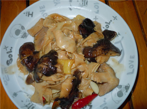 及以下步骤:姜切片,蒜和辣椒洗净不用切。 干腐竹泡开,大约半小时。 姜切片,蒜和辣椒洗净不用切。 干腐竹泡开,大约半小时。 姜切片,蒜和辣椒洗净不用切。 干腐竹泡开,大约半小时。 姜切片,蒜和辣椒洗净不用切。 干腐竹泡开,大约半小时。 香菇洗净撕成三片。 姜爆香加入香菇,煸炒2分钟后加少许水,放入辣椒及蒜。盐,鸡精,调味。焖3分钟后加入腐竹,加耗油翻炒,焖1分钟。芡粉勾薄芡。