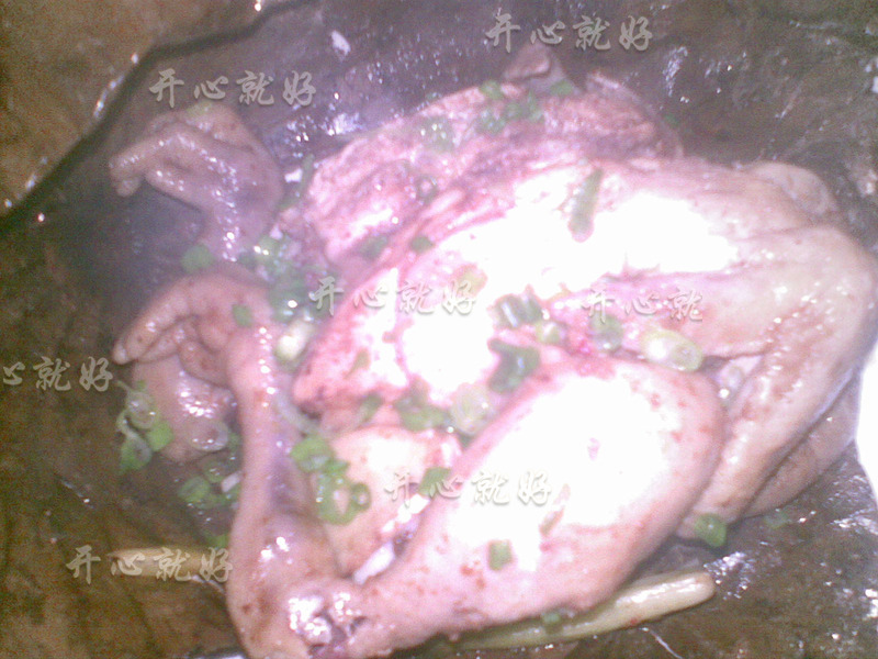 及以下步骤:揭开荷叶,满室飘香。hoho~~ 味道还是可以的,虽然和我记忆中的不同,但也算另一种飘香鸡。酒香,荷叶香and烧烤酱的香味。 准备好材料。 荷叶用清水提前泡好备用。 准备好材料。 荷叶用清水提前泡好备用。 童子鸡除去内脏洗净,料酒盐巴用生姜蘸着均匀的往鸡身上抹,约3分钟左右,要抹仔细点。 用烧烤酱涂满整只鸡,里外都要。然后静静放置15分钟左右,腌渍入味。 在鸡的腹内放一些生姜片,葱段和蒜头,表面也放一些。 用荷叶包好,上锅蒸40分钟左右。可以用筷子来试,能轻易穿透的时候就差不多了。 揭开荷叶,满室飘香。hoho~~ 味道还是可以的,虽然和我记忆中的不同,但也算另一种飘香鸡。酒香,荷叶香and烧烤酱的香味。