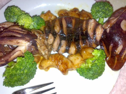 老爸的拿手菜就是炒鱿鱼,哈哈,是真的炒鱿鱼,不是延伸含义。过年在家时,还向他请教怎么在鱿鱼身上切花呢。看到酷克壹佰的日式照烧酱,想到必胜客的照烧鱿鱼仔,于是就有了这道仿制版的照烧鱿鱼。超市里没买到小鱿鱼仔,只好用大只鱿鱼代替了。