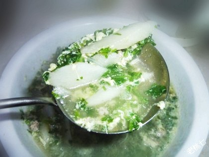 及以下步骤:一两分钟后放入荠菜。 准备个鸡蛋,咱来漂点蛋花。 漂蛋花要快速搅拌。 放入少许盐。 鸡精少许。 加点香油提味,收工。 噔噔噔噔,成品。 近拍一张。 噔噔噔噔,成品。 近拍一张。