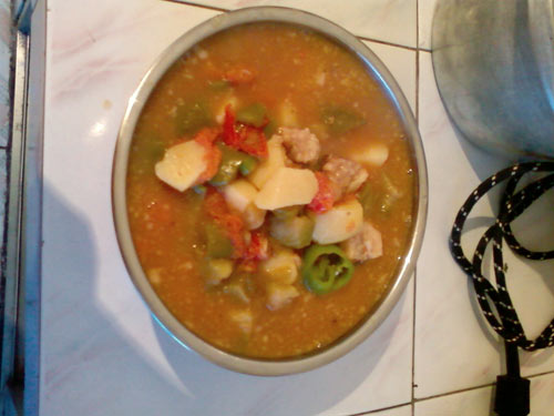 及以下步骤:水烧开之后放土豆茄子块和红烧肉,罐装的红烧肉油比较大,可以再下锅之前撇掉一些,但是因为茄子吃油,所以还是要留多一些油的 炖到茄子土豆熟透 放入西红柿块和辣椒圈,因为本身的红烧肉罐头已经是调好味的,所以只要加入一点盐就可以,其他的调料什么都不必加。因为之前的茄子和土豆都是炖熟的,所以加入西红柿和辣椒之后,只要稍微炖一下就可以出锅了 红烧肉罐头一个 尖椒2个切成辣椒圈 西红柿洗净去蒂切块 水烧开,因为要先炖土豆和茄子,所以要多一些水 水烧开之后放土豆茄子块和红烧肉,罐装的红烧肉油比较大,可以再下锅之前撇掉一些,但是因为茄子吃油,所以还是要留多一些油的 炖到茄子土豆熟透 放入西红柿块和辣椒圈,因为本身的红烧肉罐头已经是调好味的,所以只要加入一点盐就可以,其他的调料什么都不必加。因为之前的茄子和土豆都是炖熟的,所以加入西红柿和辣椒之后,只要稍微炖一下就可以出锅了