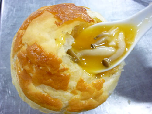 及以下步骤:鸡汤中加入蟹味菇,鱼翅,南瓜茸,加盐,鸡精,火腿汁调味,加点芡汁烧成稍浓一点的汤。把汤倒入盅里,不要太满。 把汤冷却至温热,再把酥皮盖上。包酥皮的时候不能从上向下用力,而是从侧面用力把盅口密封起来。 鸡汤中加入蟹味菇,鱼翅,南瓜茸,加盐,鸡精,火腿汁调味,加点芡汁烧成稍浓一点的汤。把汤倒入盅里,不要太满。 把汤冷却至温热,再把酥皮盖上。包酥皮的时候不能从上向下用力,而是从侧面用力把盅口密封起来。 鸡汤中加入蟹味菇,鱼翅,南瓜茸,加盐,鸡精,火腿汁调味,加点芡汁烧成稍浓一点的汤。把汤倒入盅里,不要太满。 把汤冷却至温热,再把酥皮盖上。包酥皮的时候不能从上向下用力,而是从侧面用力把盅口密封起来。 沿盅口2.5cm以下划一刀,把多余的酥皮去掉。 在酥皮表面刷上一层蛋液。 220°c 入烤箱,待酥皮鼓起,下调至180°c的炉温烤酥。 烤好的酥皮海鲜蘑菇盅。