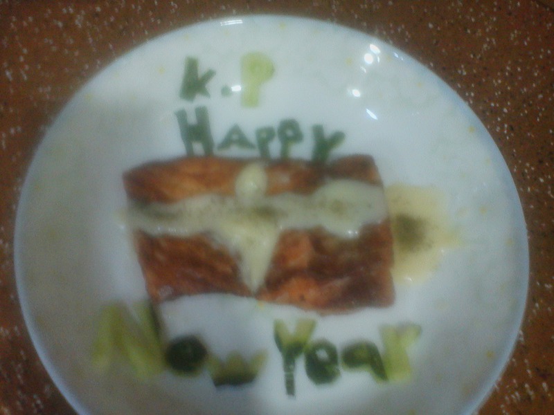 三文鱼先用盐一点点,和红酒腌制半小时。 黄油入锅融化,三文鱼中火煎制,中火是为了锁住水分。 然后我调制了个白汁。 黄油融化,小火炒面。面呈现淡黄色,倒入少许牛奶,不停的搅拌。呈粘稠状,调味。盐和鸡精。 淋在三文鱼上,然后在白汁上撒少许法香碎。 最后我用黄瓜,刻了几个字。 k.p happy new year