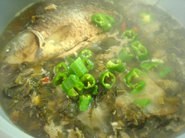 我的家乡在酸菜之乡,用盖菜腌出来的酸菜肉厚味醇,味酸爽脆嫩,所以湖南人吃酸菜煮鱼就跟辣椒炒肉一样平常,没外地人的那么讲究还片鱼片什么的,黄古鱼,鲫鱼,草鱼,雄鱼头煮酸菜是最家常的了,家里来客人了便是称了鱼回家酸菜一煮,火锅烧上后下青菜吃。 感觉我们那一年四季都在吃火锅干锅,也没见怎么上火,让我想起怀宝宝去医院做产检时,医生查大家的尿检单子,一些吃过那种大大的甜甜的红辣椒的孕妇都被检查出来被医生狂批,我天天吃尖辣椒炒肉都没让检查出来,汗,吃辣椒吃出抗体来了,所以我女儿现在也好会吃辣椒,呵呵,比较好伺候,朋友家小孩一丁点辣椒都不能见,否则一口饭都不吃,人都急死,羡慕我羡慕得见一回说一回。