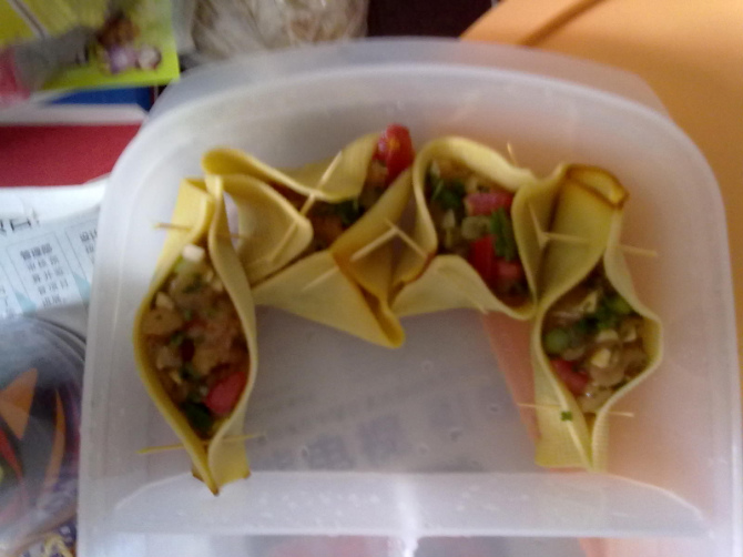 3、在豆皮上填馅儿,用牙签固定。馅儿饱满一些也无所谓,因为微波过程中什锦包会很多析出水分和油,这也是不放油的原因之一,想减肥的美眉也可以吃这道以肉为主料的菜。