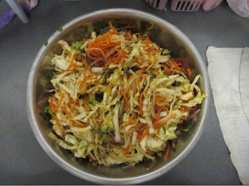 1、白菜,黄瓜,胡萝卜切丝,加盐去水,因为蔬菜会出很多水,要是不介意的话可以省略去水这个步骤.