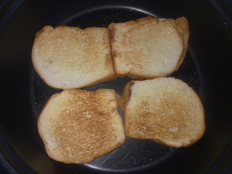3、面包两面金黄后 就可以出锅了 我在锅里涂了炼乳 吼吼~~老公喜欢吃这种 而我喜欢出锅后沾着炼乳吃~~。
