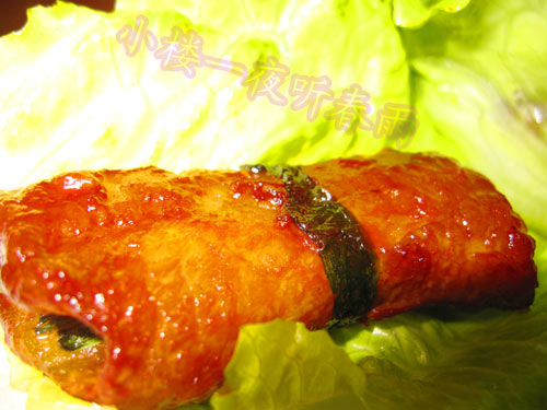 5、用生菜包住五花肉卷一起吃,香而不腻。