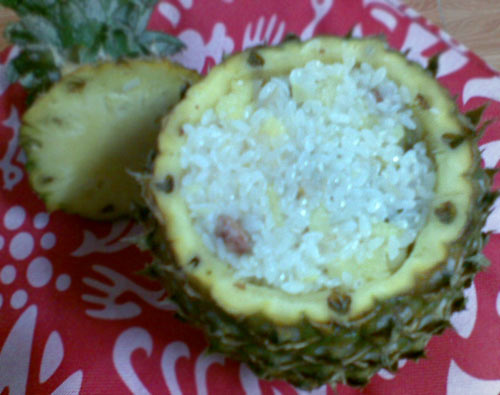 及以下步骤:固定好的菠萝放入沸水锅中继续蒸20-25分钟,使米饭充分吸收菠萝中的香甜味。 完成啦,开始享用吧。 菠萝洗净切去头部(大约五分之一处)。 将切好的菠萝用小刀配合汤匙将果肉挖出,用淡盐水浸泡。 荷叶、糯米提前浸泡好(糯米要浸泡3小时左右,荷叶半小时就够了)。将泡好的糯米沥干水包入荷叶中上锅蒸熟。 把花生、葡萄干、芝麻、菠萝与蒸好的糯米加少许油、白糖混合均匀。 混合均匀的米饭填入菠萝容器中。 将菠萝的头部盖好,用牙签固定住。 固定好的菠萝放入沸水锅中继续蒸20-25分钟,使米饭充分吸收菠萝中的香甜味。 完成啦,开始享用吧。