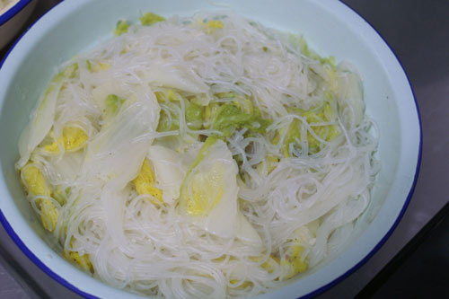 1、米粉冲一下水、夏阳白切好。