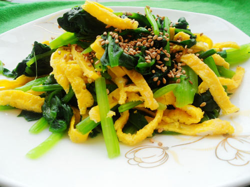 4、菠菜、蛋皮丝加盐、香油拌匀,撒芝麻装盘开吃