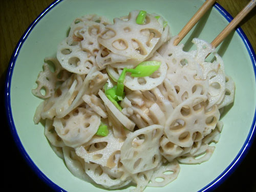 6、将煮好的莲藕盛入料汁之,拌匀,再淋上香油,晾凉即可。
