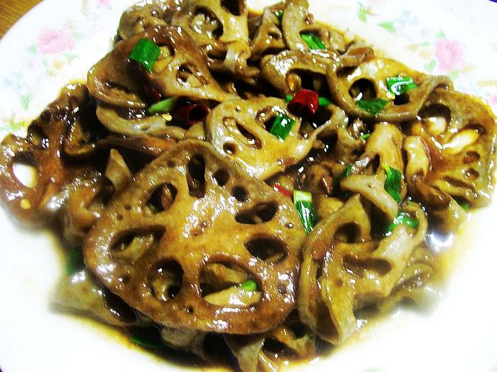 及以下步骤:捞出藕片,控干水分,上面撒上适量干面粉,藕片两面分别沾上面粉。 藕切薄片,放清水中浸泡后,锅内放适量清水,烧开后,将藕片焯一下。 捞出藕片,控干水分,上面撒上适量干面粉,藕片两面分别沾上面粉。 藕切薄片,放清水中浸泡后,锅内放适量清水,烧开后,将藕片焯一下。 捞出藕片,控干水分,上面撒上适量干面粉,藕片两面分别沾上面粉。 藕切薄片,放清水中浸泡后,锅内放适量清水,烧开后,将藕片焯一下。 捞出藕片,控干水分,上面撒上适量干面粉,藕片两面分别沾上面粉。 锅内放适量植物油,将藕片放入,炸至微黄捞出控油。 锅内留适量底油,放入藕片,加酱油、少量糖、适量水、盐,炖5分钟。 放入红辣椒段(喜欢辣的就先炸完辣椒再放藕片)和青段蒜,翻炒均匀即可。