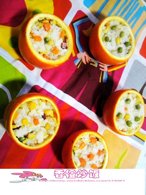 及以下步骤:再放火腿丁。 炒匀调入盐出锅。 将橙子顶部三分之一去掉,扣出果肉,盛入炒饭就好。 倒入鸡蛋滑炒。 再倒入胡萝卜丁炒。 倒入豌豆、玉米粒,灿烂这个是之前用开水焯烫过的,所以稍炒一下就成。 倒入米饭。 再放火腿丁。 炒匀调入盐出锅。 将橙子顶部三分之一去掉,扣出果肉,盛入炒饭就好。
