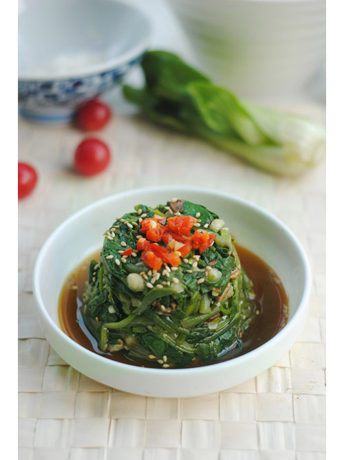 2、水中加少许盐和油,放入菠菜绰烫一下。